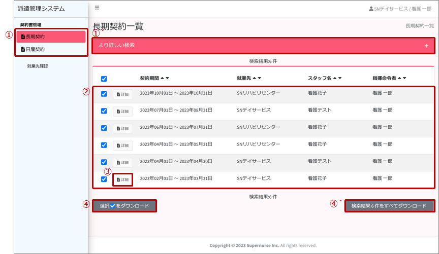 2.4.長期/日雇契約2023年7月13日 更新契約一覧が表示されます ①、①´ 契約の絞り込みをします ② 契約一覧が表示されます ③ 契約の詳細を確認します ④、④´ 契約に関連する全書類をPDFファイル形式でダウンロードします
